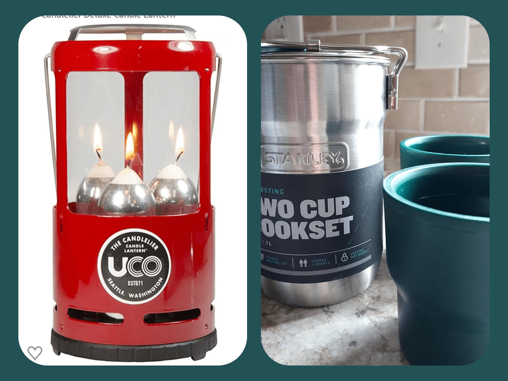 UCO 3 candle burner has 5,000BTUs- Just place the Stanley mini pot on top to make tea, or if you want, you can place a soup can right on top and heat it up too.